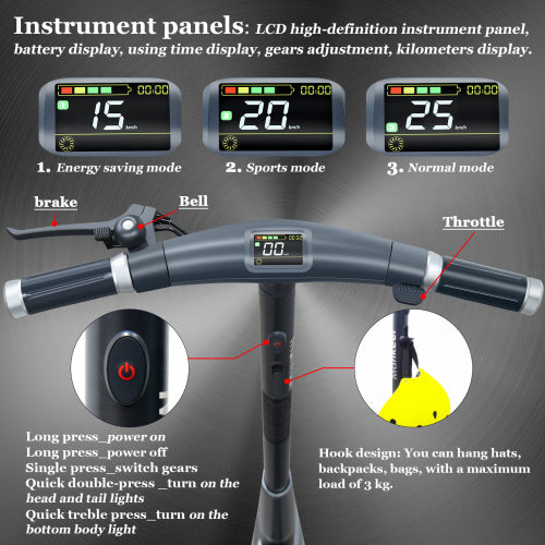 6. Smart LCD Display & Multi-Function Switch.?The new LCD display can adjust the speed, speed gear, battery power, lighting and usage time. The multi-function buttons can adjust the lights (headlights/taillights/bottom lights) and speed gear adjustment